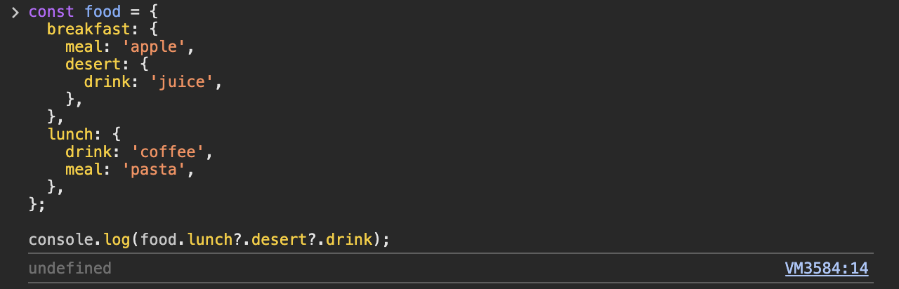 console.log(food.lunch && food.lunch.desert && food.lunch.desert.drink);