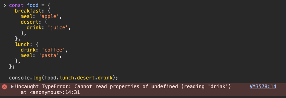 위 코드 같은 음식 데이터를 가지고 있는 객체(Object)가 있을 때 콘솔에 적힌 객체에 접근하면 타입에러가 뜹니다.