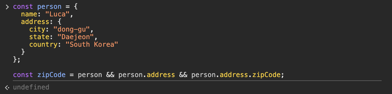 위 코드에서 person?.address?.zipCode가 undefined 또는 null일 경우에는 뒤의 코드가 실행되지 않으므로 if문을 사용하여 체크할 필요가 없어지죠 !