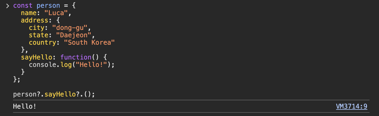 따라서 Optional chaining을 사용한다면 굳이 if문을 사용하여 sayHello 메서드가 존재하는지 체크할 필요가 없어지는겁니다.