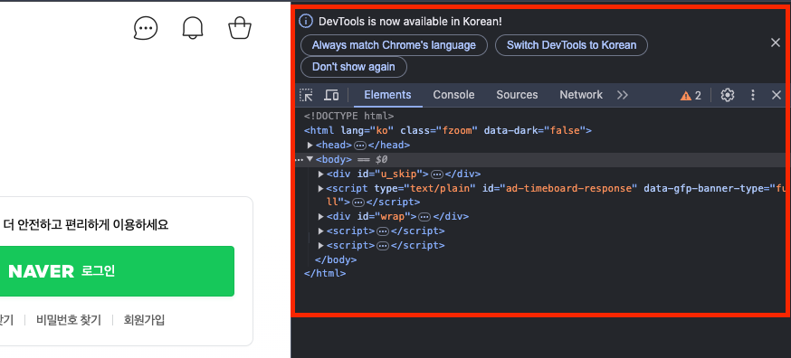 *간혹 가다가 어떤 키(F12)를 잘못 눌러서 뜬 화면이 있으실 텐데요 이 <>가 들어가 적혀있는 텍스트 부분을 'HTML언어'라고 합니다.