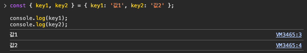 const { key1, key2 } = { key1: '값1', key2: '값2' };