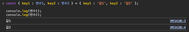 const { key1 : 변수1, key2 : 변수2 } = { key1 : '값1', key2 : '값2' };