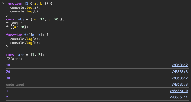 위 예제코드의 매개변수는 전달받은 인자 값을 구조 분해 할당하여 사용합니다.