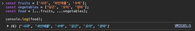 friuts와 vegetables라는 두 개의 배열을 전개 구문을 사용하여 펼친(spread) 후 합치면 새로운 배열 food를 생성할 수 있어요!