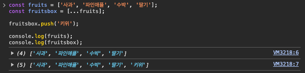 이를 통해 전개 구문을 이용하여 배열을 얕은 복사 하여 새로운 배열을 생성하므로 기존 배열과는 별개의 배열이 됩니다!