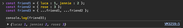 위 코드는 friend1과 friend2라는 두 개의 객체를 전개 구문을 사용하여 합친 friend3 객체를 생성합니다.
