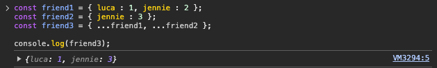 만약 두 객체에 같은 이름의 key가 있다면, key의 값(value)은 나중에 온 객체의 키값으로 업데이트됩니다!